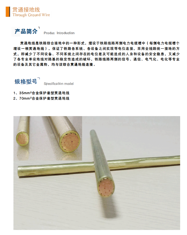 貫通地線是鐵路綜合接地中的一種形式,埋設(shè)于鐵路線路兩側(cè)電力電纜槽中(每側(cè)電力電纜槽個埋設(shè)一根貫通地線),保證了鐵路各系統(tǒng)、各設(shè)備之間實(shí)現(xiàn)等電位連接,采用全線路統(tǒng)一接地的方式,即減少了不同設(shè)備、不同系統(tǒng)之間存在的電位差及可能造成的人身和設(shè)備的安全隱患,又減少了各專業(yè)單設(shè)地線對路基的穩(wěn)定性造成的破壞,鐵路線路兩側(cè)的信號、通信、電氣化、電化等專業(yè)的設(shè)備及其它金屬物,均與該綜合貫通地線連接。