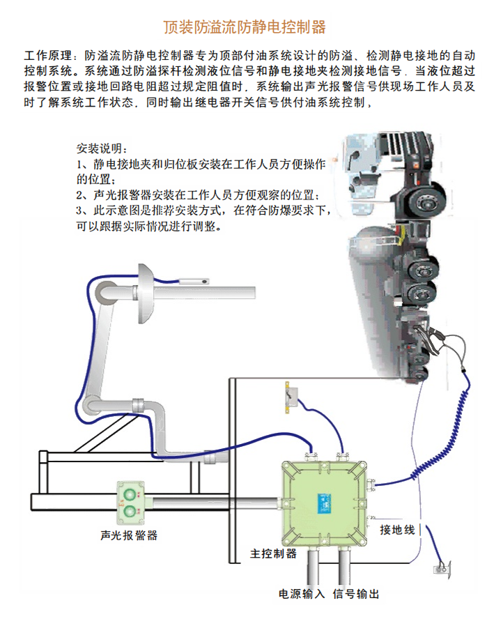工作原理:防溢流防靜電控制器專為頂部付油系統(tǒng)設(shè)計(jì)的防溢、檢測靜電接地的自動控制系統(tǒng)。系統(tǒng)通過防溢探桿檢測液位信號和靜電接地夾檢測接地信號,當(dāng)液位超過報警位置或接地回路電阻超過規(guī)定阻值時,系統(tǒng)輸出聲光報警信號供現(xiàn)場工作人員及時了解系統(tǒng)工作狀態(tài),同時輸出繼電器開關(guān)信號供付油系統(tǒng)控制,